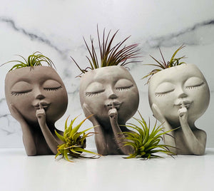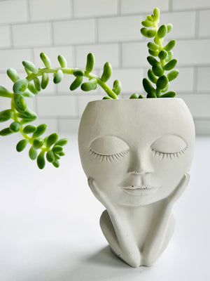 Cement/Concrete Deep Thought Girl Planter: Light Grey/White & Soft Black